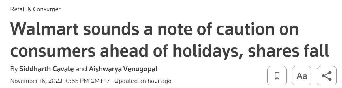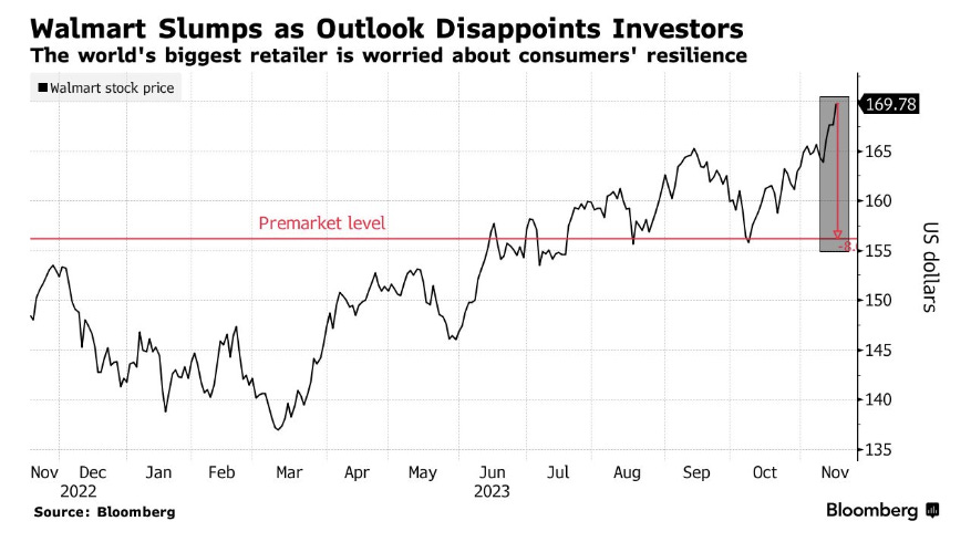Walmart reports Q3 revenue higher than expected but stock still plunges due to concerns over weakening consumer outlook ahead of the holidays.