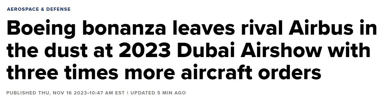 The 2023 Dubai Airshow brought Boeing three times as many aircraft orders as Airbus.