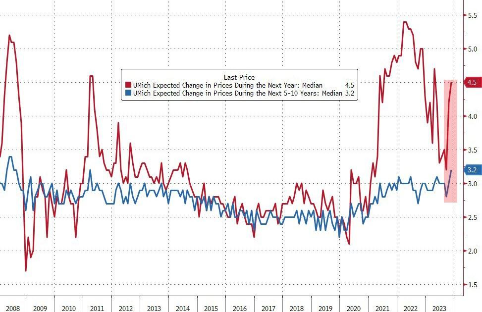 Short-term consumer inflation expectations rise from 4.4 to 4.5, and from 3.1 to 3.2 over 5-10 years (highest since 2011).