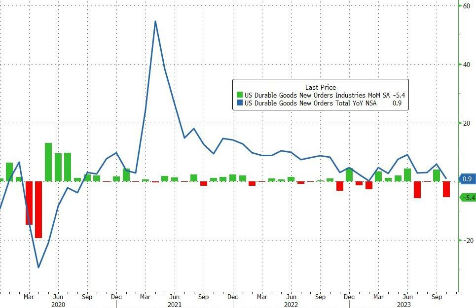 October durable goods orders plunge -5.4% MoM, after surging last month due to defense spending (+92.5% MoM September).