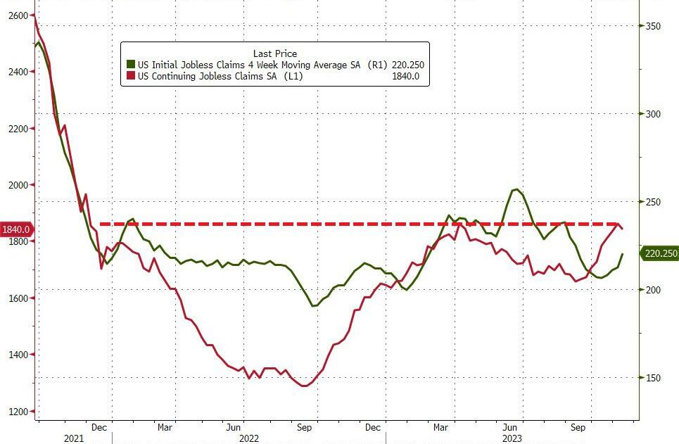 Continuing jobless claims this week dipped slightly from 1.862 million to 1.84 million, but still near 2-year high.