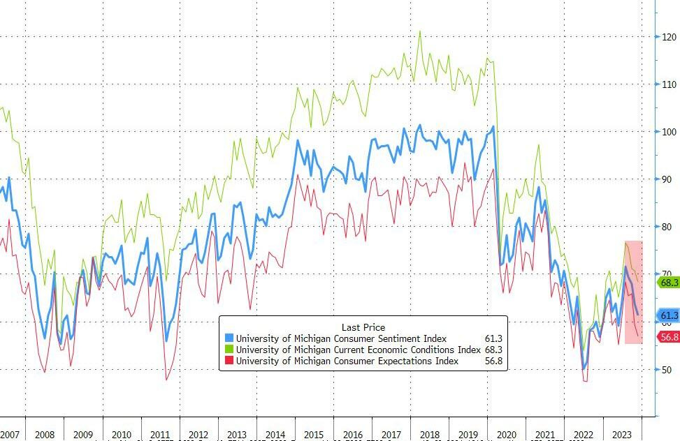 Consumer sentiment index at 61.3, higher than expected but still at 6-month low due to declining short- and long-term economic expectations.