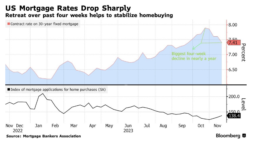 30Y mortgage rate falls -20bps to 7.41% this week, largest drop in 4 weeks, spurring a surge in new home purchase applications.