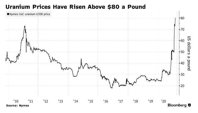 Uranium price rises above 80 USD/pound for the first time in over 15 years.