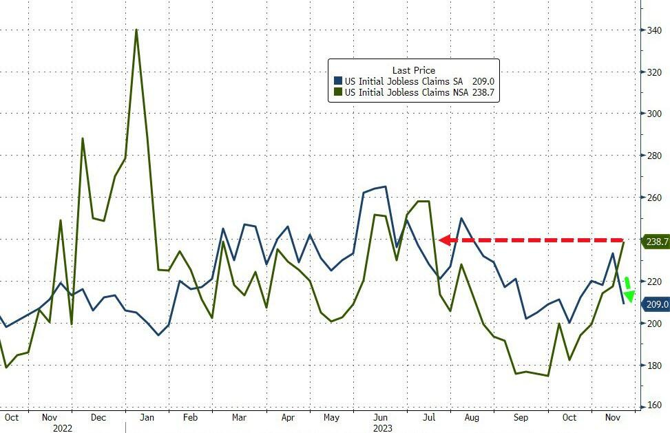 Initial jobless claims last week fell -24,000 to 209,000, below expected 225,000.