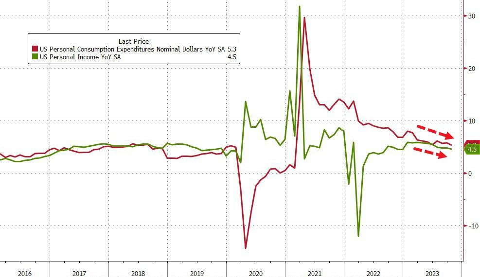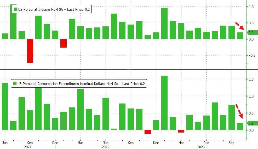 Growth in income and personal spending both cooled, both reaching +0.2% MoM as forecasted.