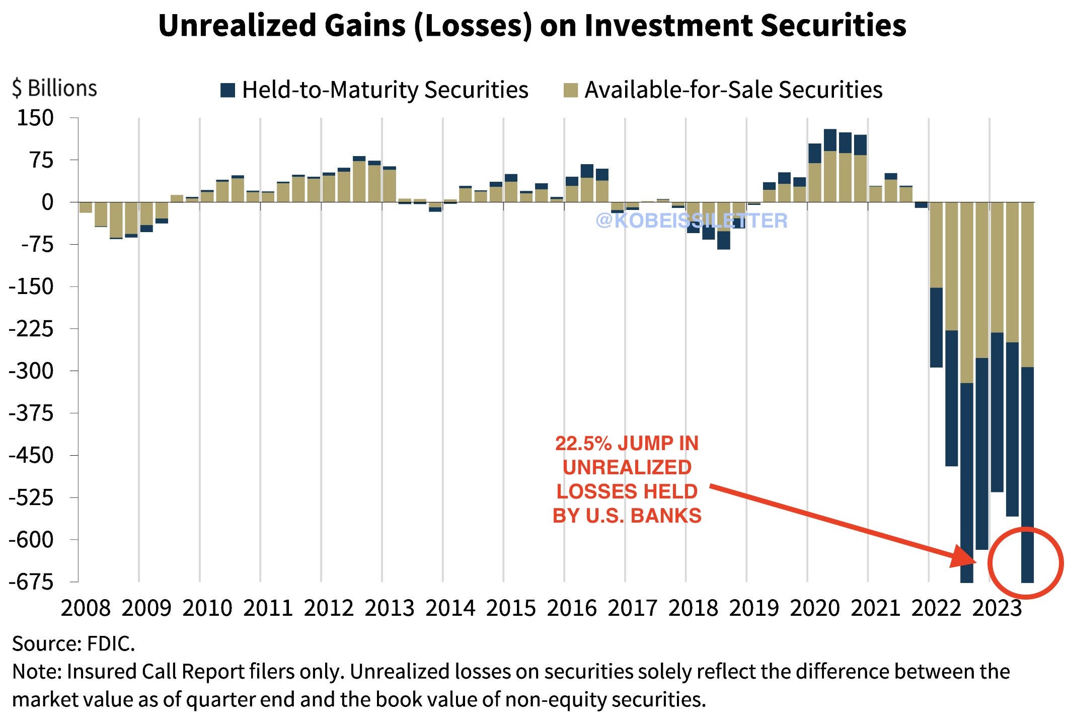 Unrealized losses of banks at record high, -684 billion USD in Q3 due to surging mortgage rates reducing the value of mortgage-backed securities.