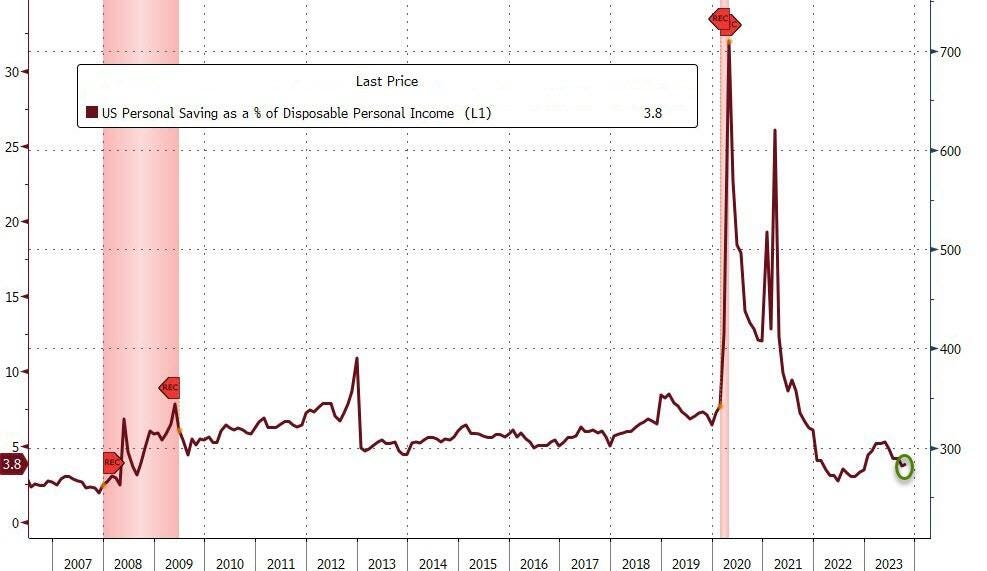 Savings rate based on % of disposable personal income (DPI - Disposable Personal Income) slightly increased to 3.8% in October.