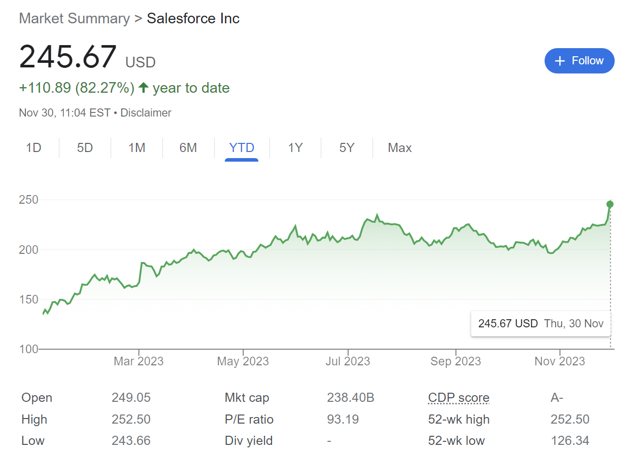Salesforce stock has risen to nearly 250 USD after the earnings report, up 80% since the beginning of the year thanks to job cut plans and cost optimization.