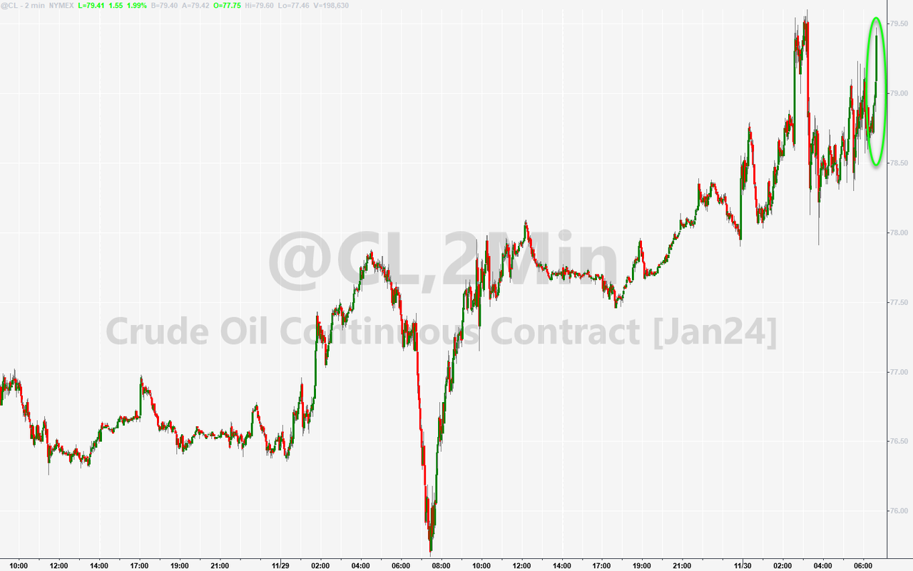 Crude oil price surges, fluctuating at 79.5 USD/barrel.