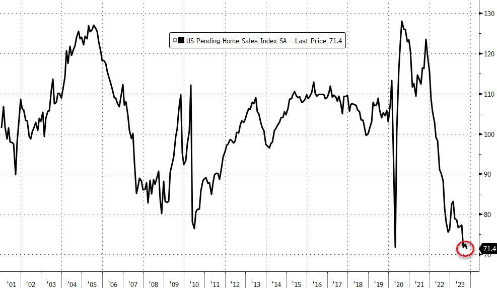 Pending Home Sales index continues to fall to record lows since 2001, lower than during the financial crisis period, indicating a bleak housing market.