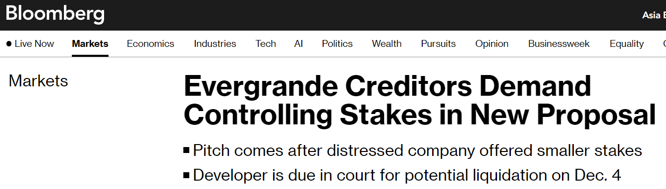 Evergrande creditors demand equity stakes to control the company's restructuring.