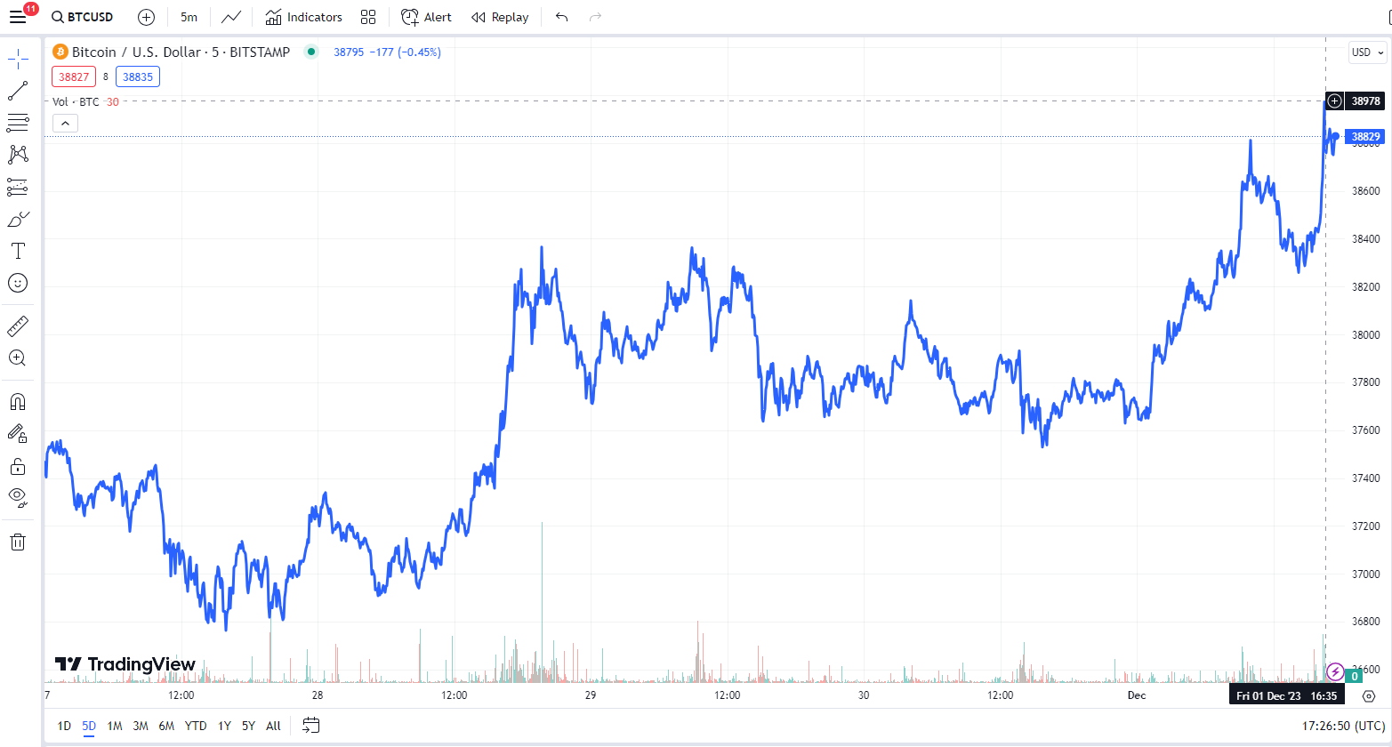 Bitcoin rises to near 39,000 USD - highest since May 2022.