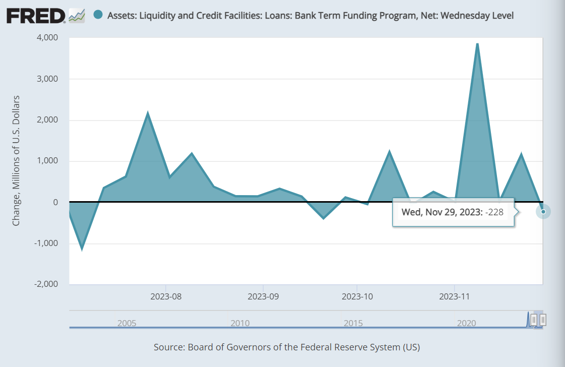 Reason due to Fed's emergency support fund for banks (BTFP) declining about -228 million USD last week vs previous.