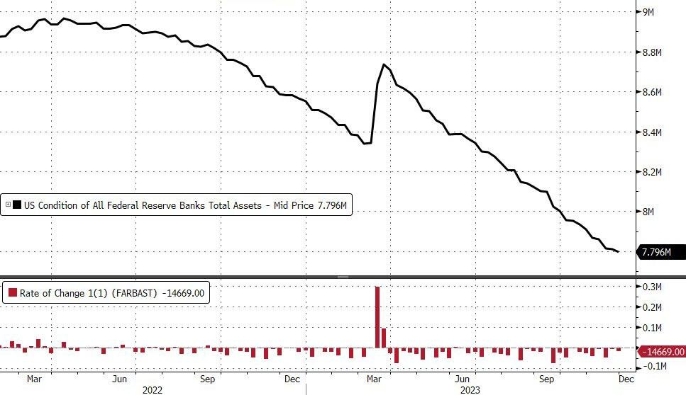 Meanwhile, Fed's balance sheet value declined sharply - total -14.7 billion USD last week to lowest since April 2021.