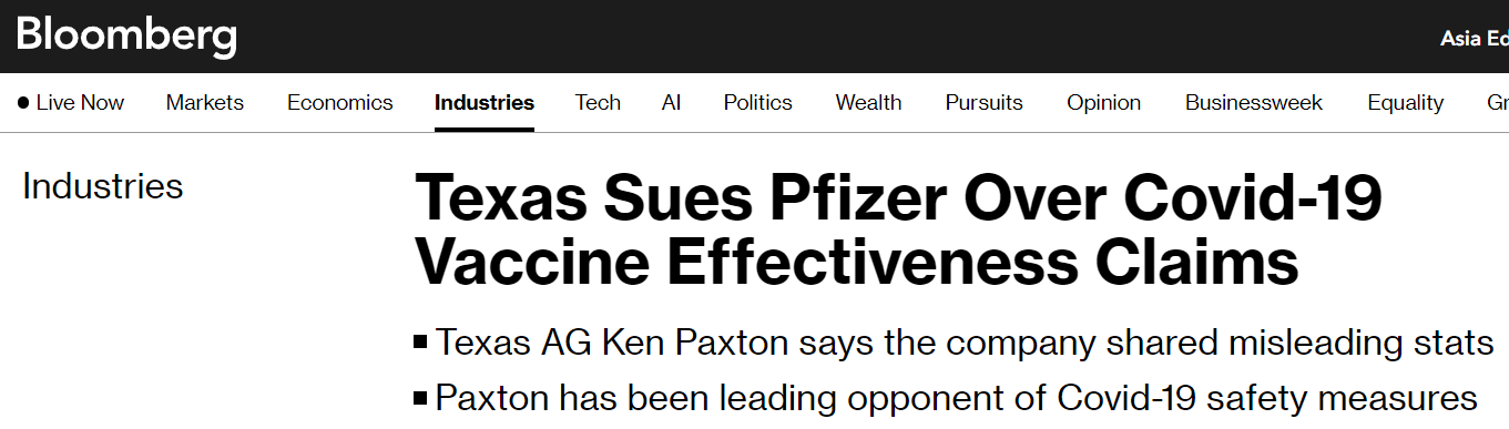 Texas sues Pfizer for allegedly providing inaccurate information on Covid-19 vaccine efficacy.