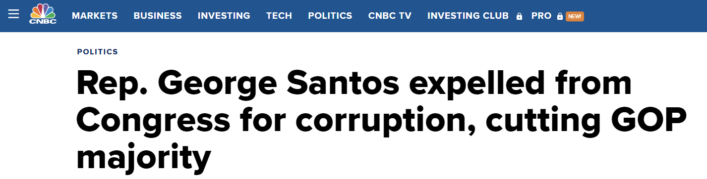 George Santos expelled from Congress for corruption, reducing Republican seats further.