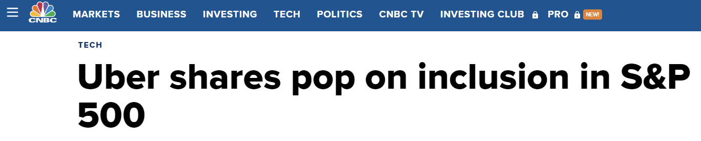 Uber stock rises nearly 5% after being included in the S&P 500.