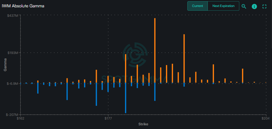 IWM, on the other hand, pushes strongly through call wall 185 with mostly organic buy volume. However, with IWM's call wall not showing signs of rolling higher, IWM is currently considered in the “overbought” zone. However, as mentioned in Friday's newsletter, IWM's options positions are generally very “loose” making gamma's influence on the index not as strong as on SPX.
