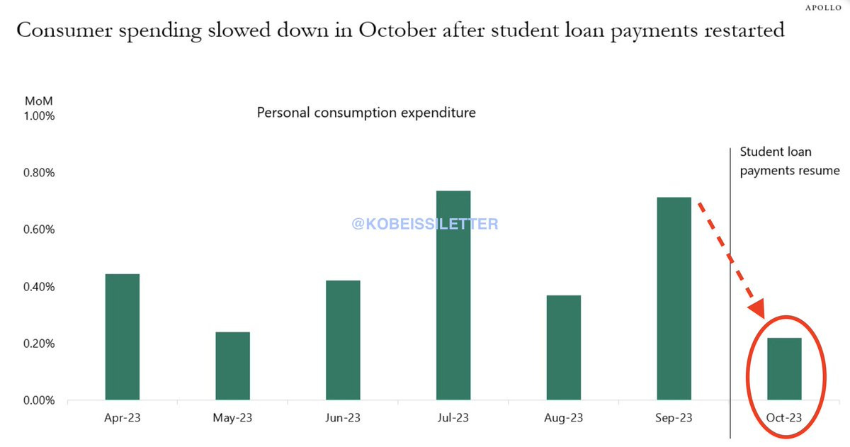 Consumer spending growth only +0.2% MoM in October, lowest in over 6 months due to cost pressures as student loan repayments resume.