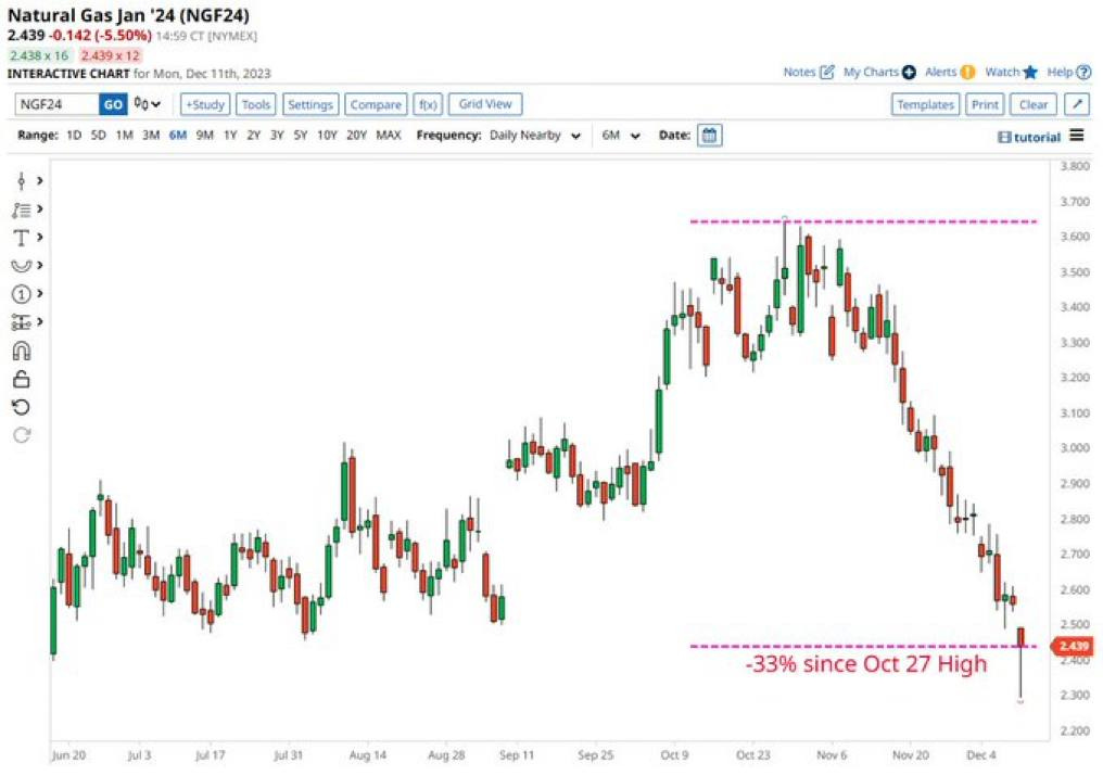 Natural gas prices have fallen 33% from the high on October 27 and are now at the 6-month low