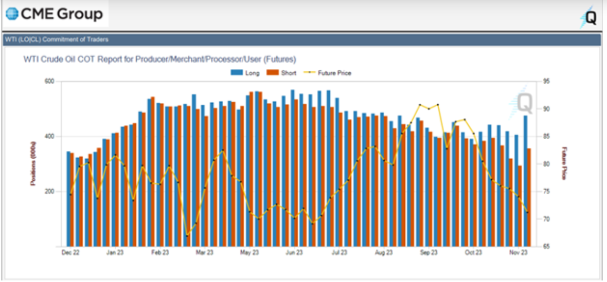Producers themselves are increasing long positions in crude oil Futures contracts (green column) — raising market concerns about a stall in oil production and higher oil prices ahead: