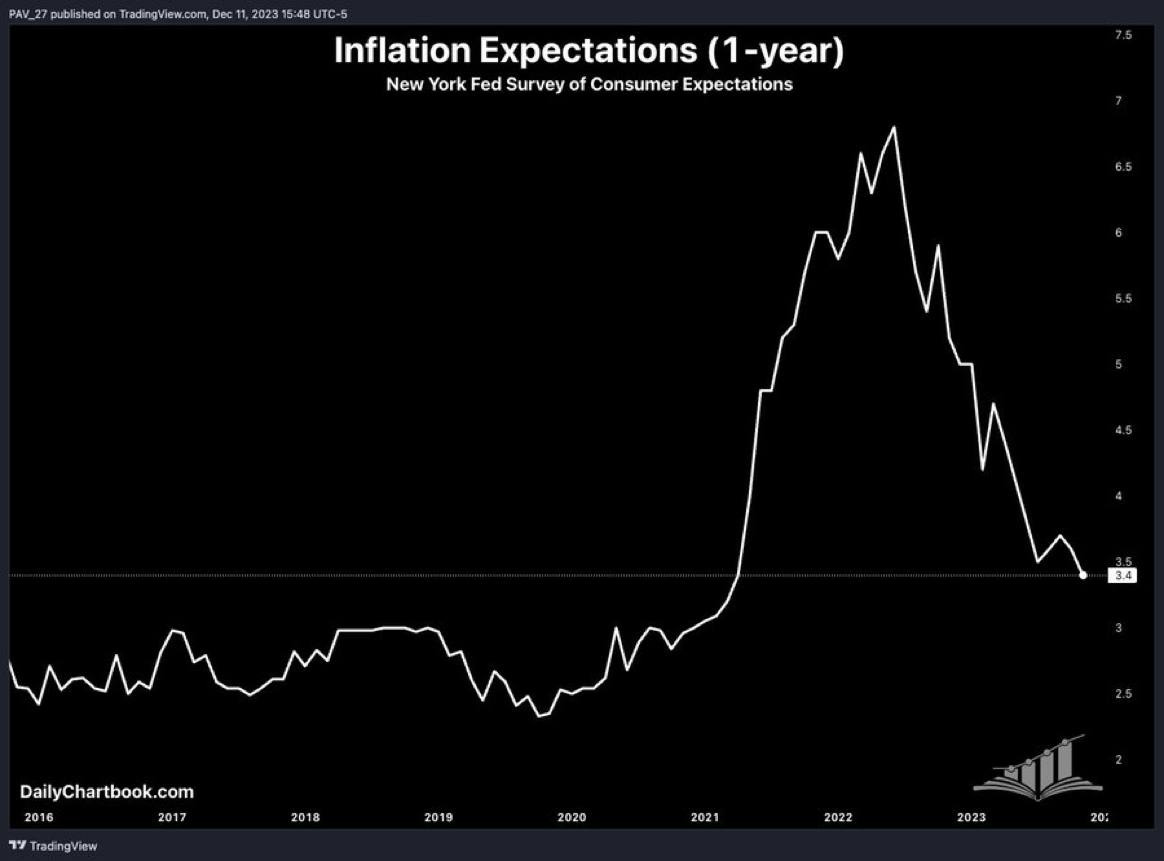 Consumer expectations for inflation over the next year fell from 3.6% to 3.4% in November, the lowest since April 2021.