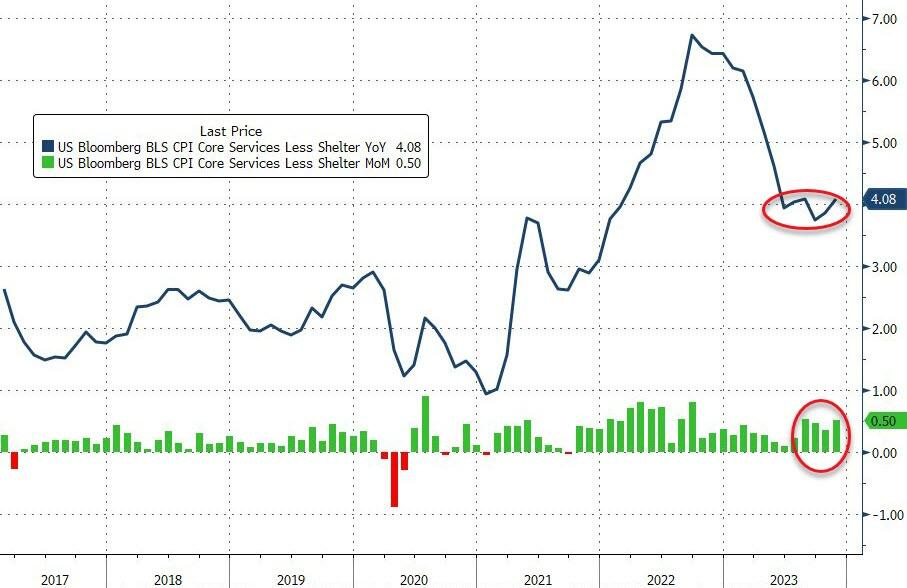 The most troubling issue for the Fed is CPI supercore (core services CPI excluding housing) up 0.5% M/M and 4.08% Y/Y (back to increasing above 4%).