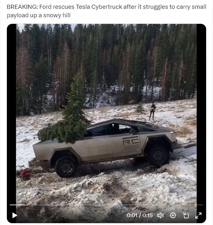 Cybertruck - the product line Elon Musk introduced as “rare”, stuck in snow and had to be helped by Ford's F-150 truck.