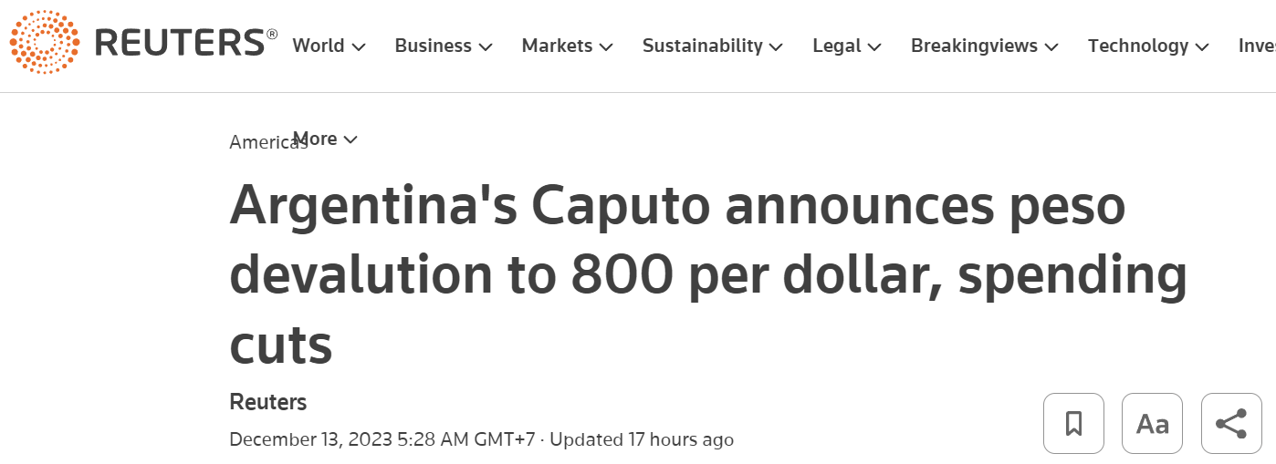Argentine President devalues Argentine peso and cuts spending to revive economy.