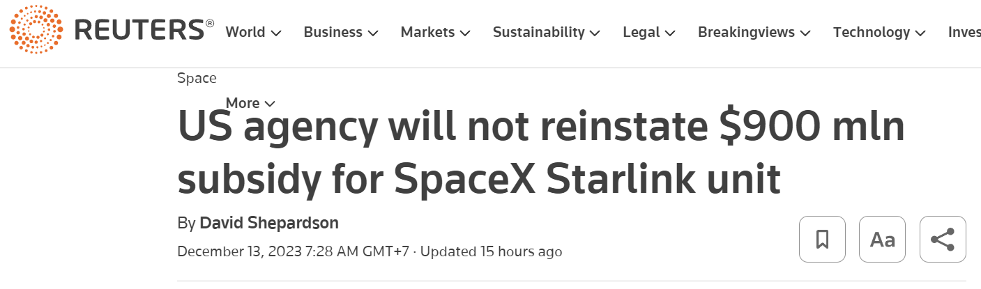 FCC Commissioner Brendan Carr voices opposition after FCC says it will not subsidize Starlink with 886 million USD.