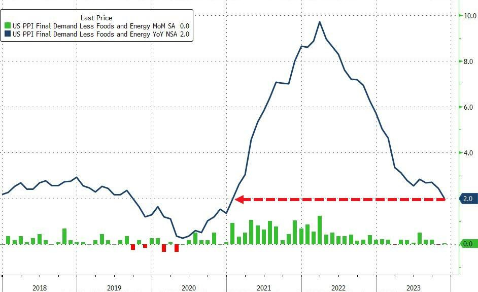 Core PPI index (excluding food and energy) reaches 2% YoY, lowest since Jan 2021.