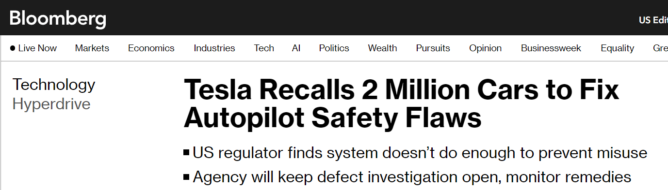 Tesla recalls 2 million cars (nearly all sold in the US) to fix Autopilot safety defect.