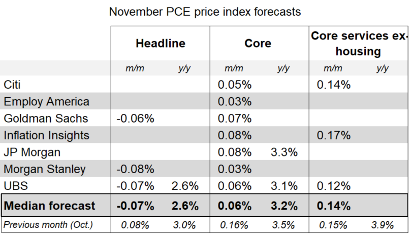 Based on November CPI and PPI, headline PCE inflation index expected to ease slightly from previous month.