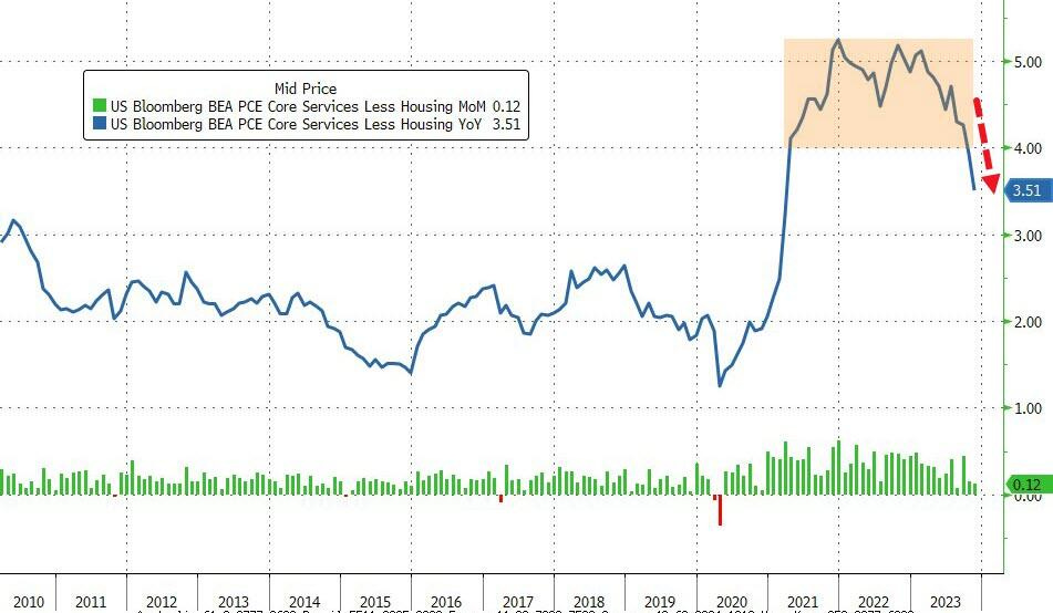 Services inflation excluding housing spending has fallen from peak to lowest since March 2021.