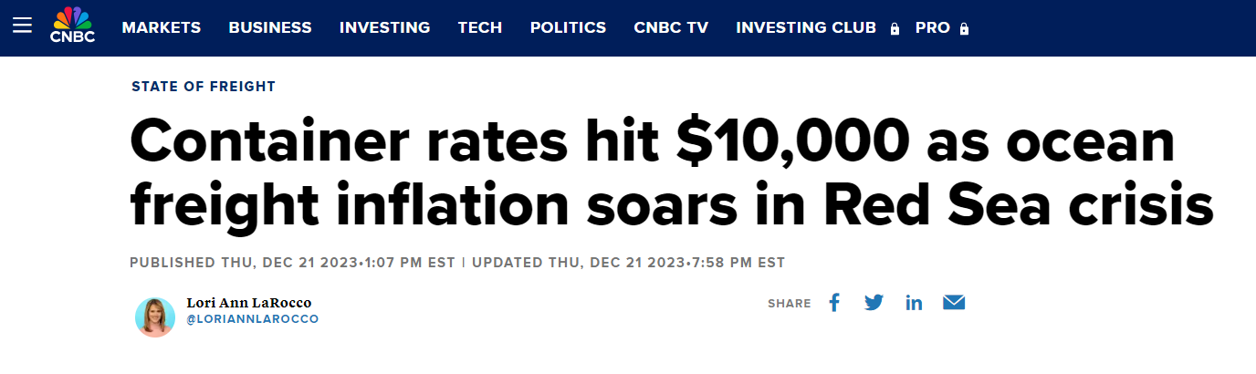 Container freight rates reach 10,000 USD as ocean freight inflation surges amid the Red Sea crisis.