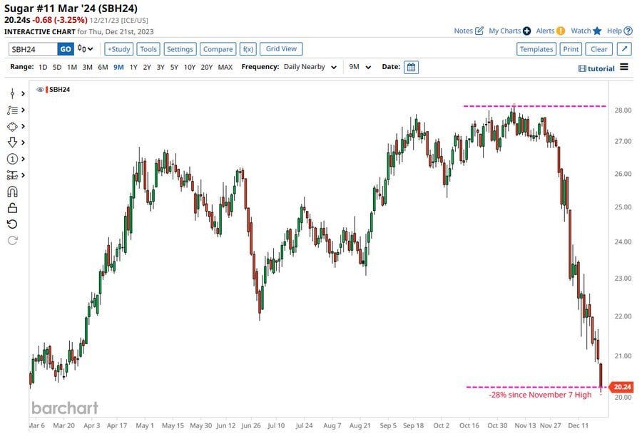 Sugar prices have fallen 28% from the high on 11/07 and are now trading at the lowest level since early March