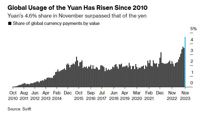 China's renminbi accounted for 4.6% of international payment transactions in November - the highest rate in history. This figure was less than 0.1% in 2010.