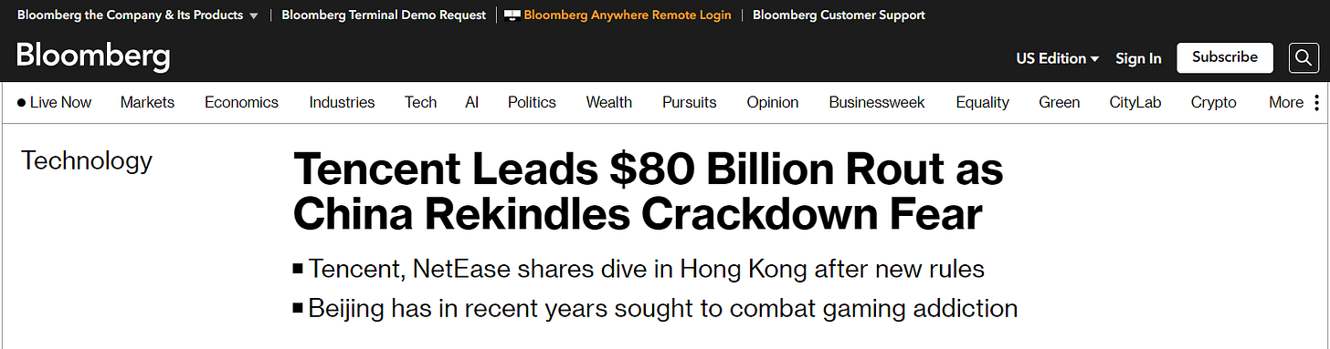 this led to sell-offs in stocks of major tech names worth 80 billion USD, led by Tencent.