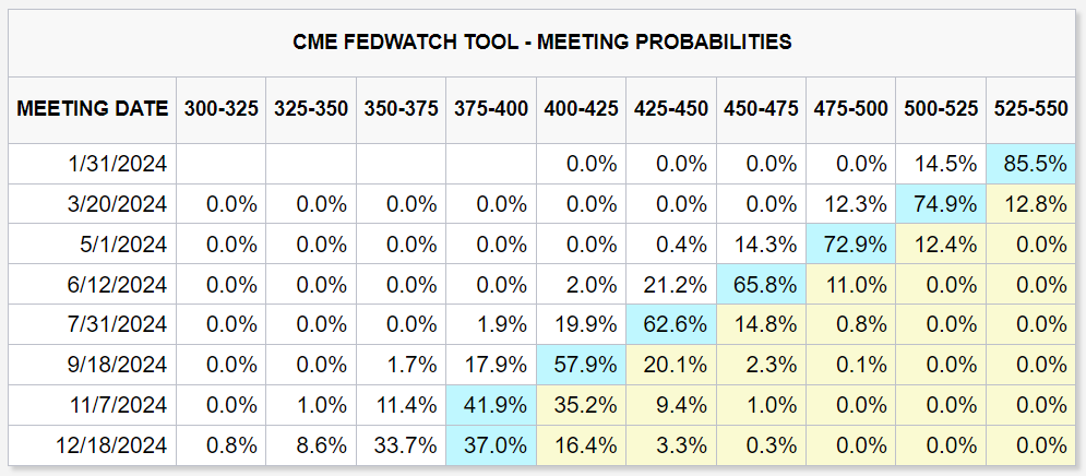 market bets 75% probability Fed will cut rates in March 2024 (and about 14.5% chance of cuts right from January).