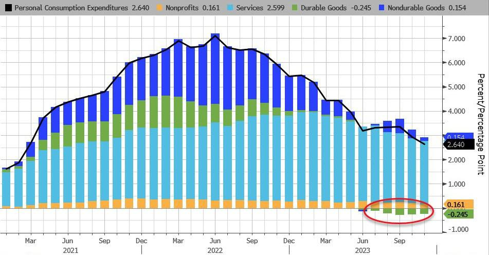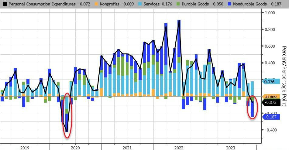 Notably, monthly PCE growth fell -0.072% MoM - the first deflation since April 2020.