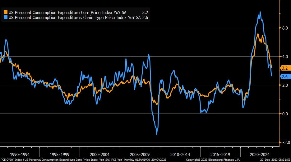 Headline PCE growth reaches +2.6% Y/Y in November, down from +2.9% previous and below expectations (2.8% Y/Y).