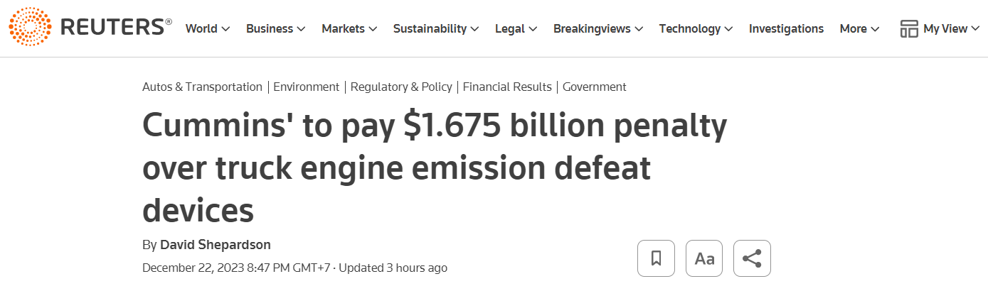 Truck engine maker Cummins must pay 1.675 billion USD fine for installing faulty emissions devices on hundreds of thousands of engines to evade regulators