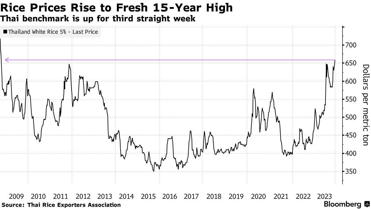 Rice prices rise to a 15-year high of 659 USD/ton after India restricts exports and dry weather threatens production.