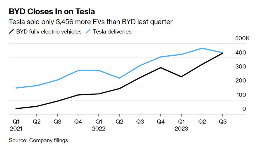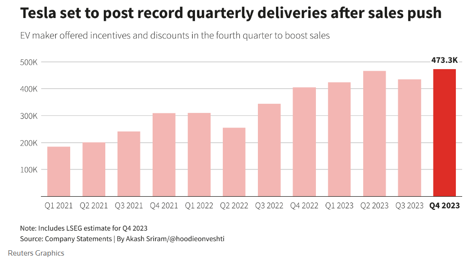 For Q4/2023, Tesla is expected to report record quarterly EV sales after letting BYD nearly catch up in the previous quarter: