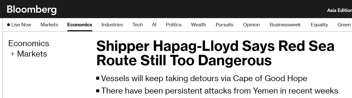 Container freight rates have risen 26% over the past four weeks, however, ship owners are still rerouting ships to avoid attacks.