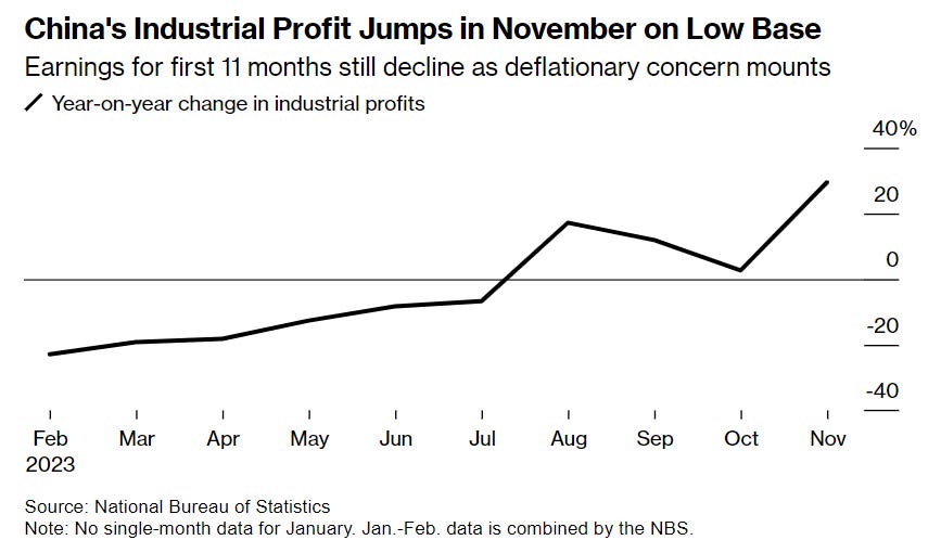 China: November industrial profits surge unexpectedly +29.5% YoY despite prolonged deflation fears thanks to a series of economic stimulus measures.