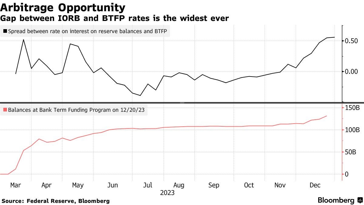 The spread between IORB rate (interest rate on reserve balances at the central bank) and BTFP rate is wider than ever.