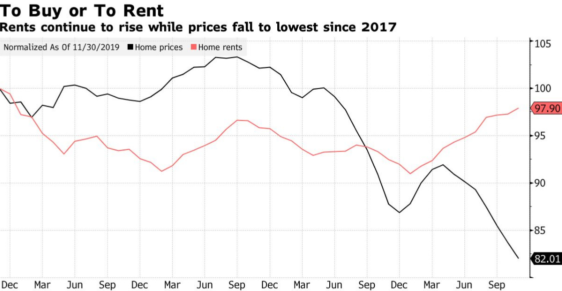 Hong Kong home prices fell 2% in November, the lowest since 2017 due to high interest rates limiting purchasing power.