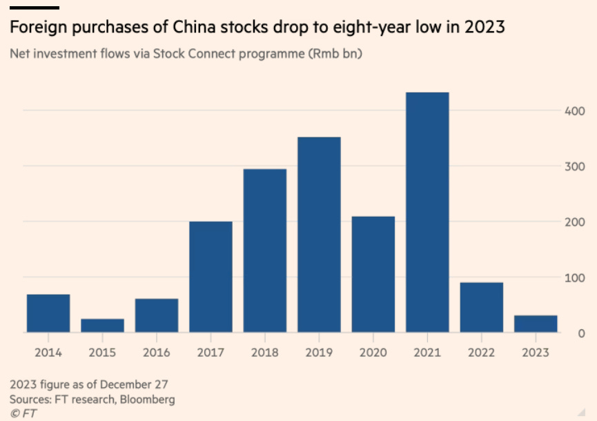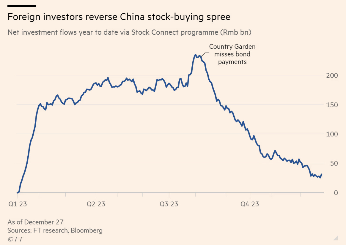 Nearly 90% of the money poured into Chinese stocks in 2023 has been withdrawn net, adding to doubts and concerns about the country's economic prospects.